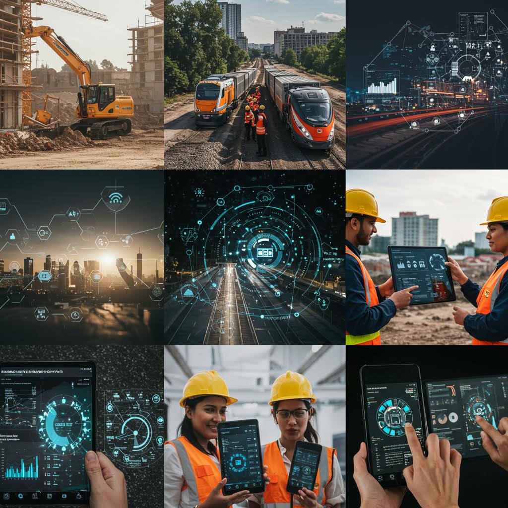 9개의 건설 및 인프라 관련 이미지 그리드. 중장비가 작업하는 건설 현장, 야간 도로, 작업자들이 태블릿을 보는 모습, 홀로그램 인터페이스 등 현장과 디지털 기술이 결합된 스마트 건설 환경을 보여주고 있다.